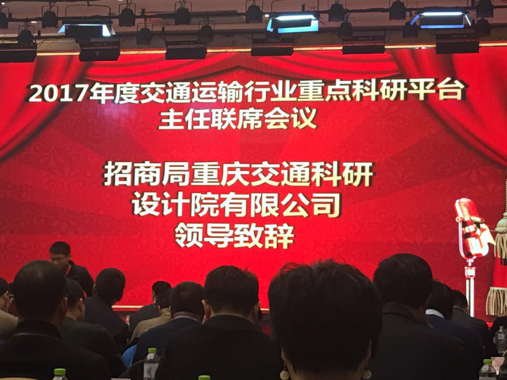 由重庆交通大学和招商局重庆交通科研设计院有限公司承办的2017年度交通运输行业重点科研平台主任联席会议于2018年1月10-11日在重庆华商国际会议中心举行。本次会议的主题为:(1)总结回顾一年来科研平台在科技创新、成果转化、人才培养等方面的成效;(2)深入开展经验交流和合作对接,进一步整合资源,增进行业内外科研平台间、与企业间横向沟通合作;(3)宣贯国家和行业重大政策,明确科研平台发展方向和重点;(4)聚焦国际技术前沿最新动态,凝练行业重大科技创新方向。