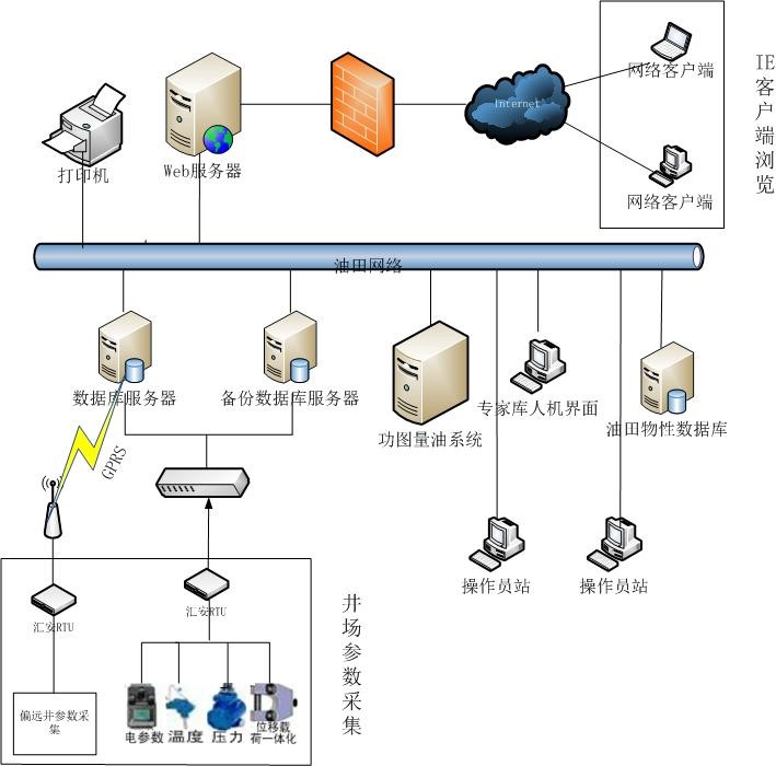 该系统是由安装在抽油机上的各种传感器采集参数,通过RS485通讯传输到抽油机控制柜进行处理和分析,然后通过GPRS/CDMA无线通讯反馈到数据中心,实现远程数据实时监测、远程油井自动化控制、在线计量等功能,并且系统具有丰富的图表和报表功能。