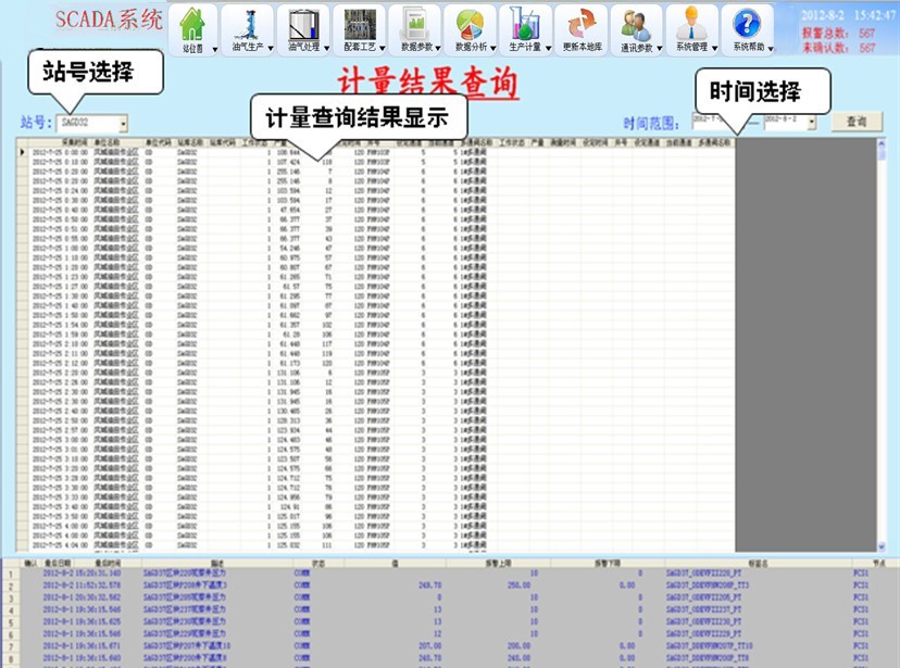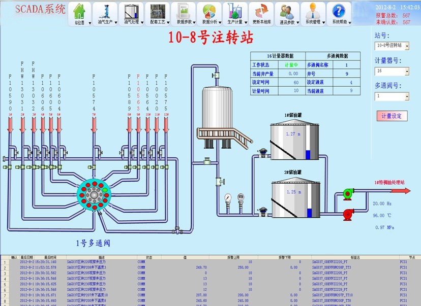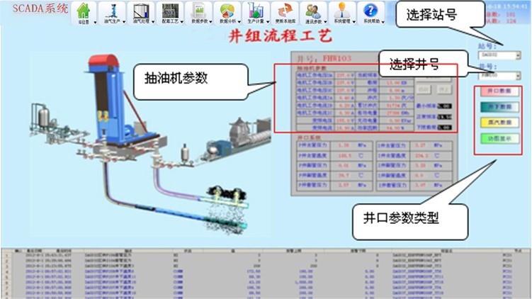 利用实时采集的数据动态显示油井、联合站、注水站工艺的流程。主要包括:油井工艺流程、锅炉工艺流程、注水站工艺流程、联合站工艺流程、配套工艺流程等功能。