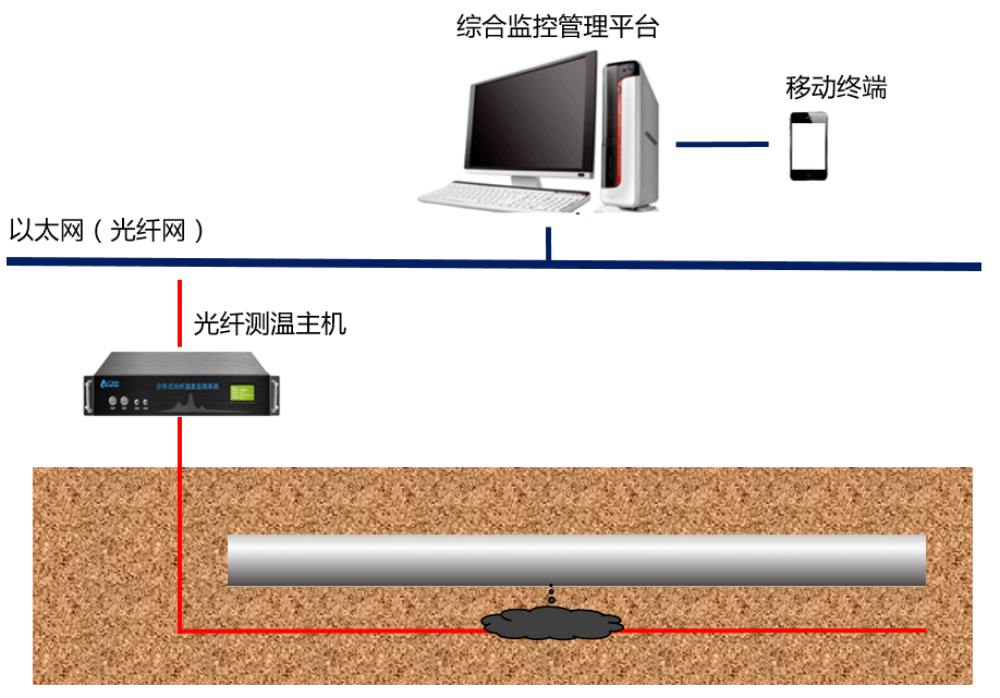 系统采用标准单模光缆作为传感器,利用与管道同沟敷设的通信光缆中的1芯作为探测光缆,可实时感应管线周围温度变化情况,对管线泄漏产生的温场变化进行及时报警,并对泄漏位置准确定位。