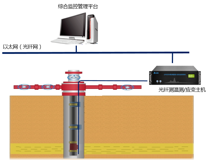 油井井下温度、压力监测系统是将分布式光纤安装在油井井筒内,可对油井井筒内温度、压力进行实时监测,通过地面解调终端将井下温度剖面、压力分布情况进行实时全程测量并完成数据记录,通过对测量数据分析,可有效优化生产、管理油藏、提高采收率。