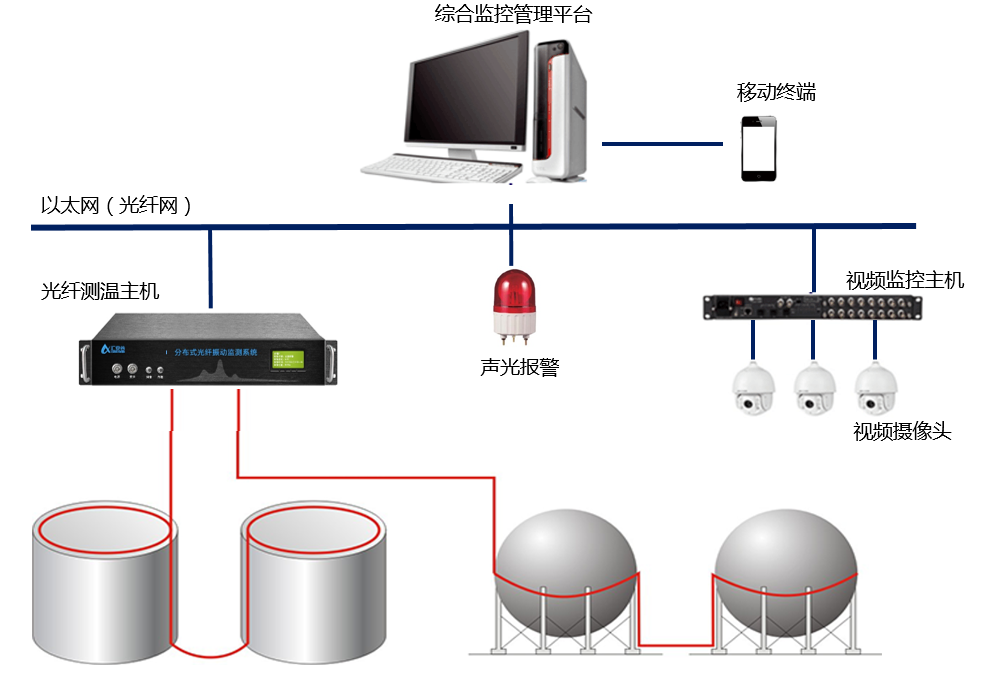 油气储罐安全监测系统是利用分布式光纤温度监测系统通过实时监测油气储罐温度的变化情况,确保油料加热均匀,防止原油凝罐、管道凝堵、火灾等事件的发生;并且利用分布式光纤振动监测系统对油罐罐区进行实时监测,有效防止非法入侵,保障油罐罐区的安全。