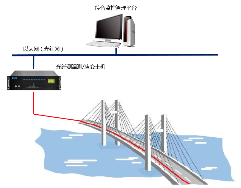 分布式光纤应变和温度传感解析系统对桥梁、大坝结构健康进行分布式实时监测,可以实现对桥梁、大坝的应变、位移、温度、振动、沉降、倾斜、索力等多参数监测。同时对系统的解调数据进行分析,形成桥梁、大坝监测数据库,可以用于结构健康诊断、报警。