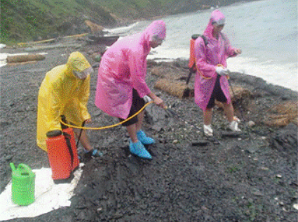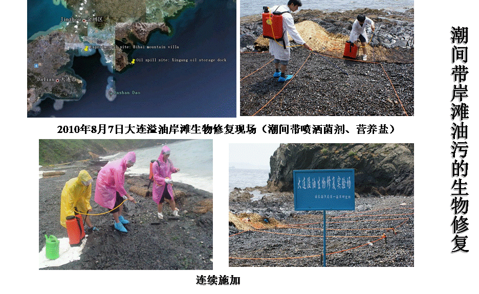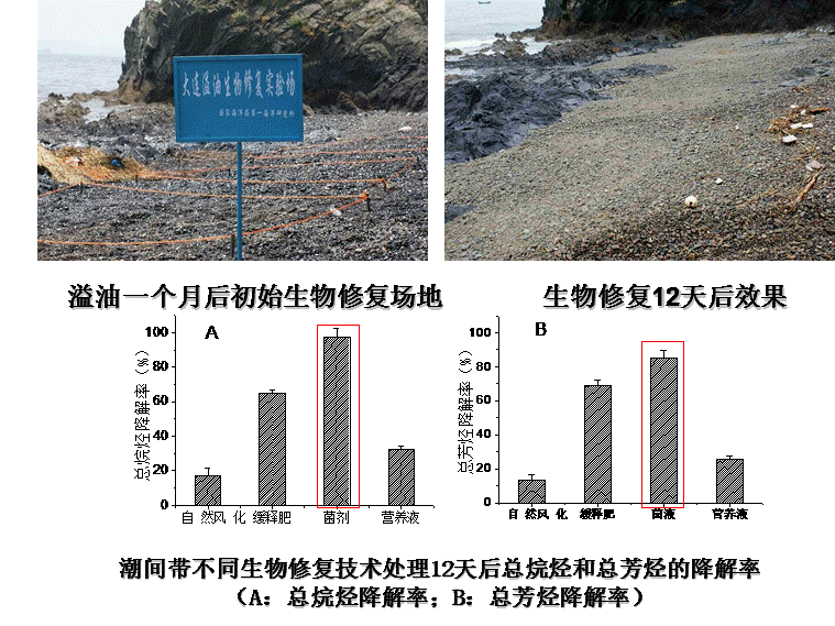 2010年7月16日,大连新港输油管道爆炸引起的溢油污染事件,该菌剂进行了现场应用。将筛选自海洋的三种石油降解菌经冷冻干燥工艺制备冻干菌粉。现场应用时,需在相应培养基内活化,然后复配成混合菌液,进行场地施用。将复配的菌剂应用于石油污染岸滩,生物修复区降解效果显著提高,较对照区,其总烷烃和总芳烃的降解率提高70%以上,修复效果显著。使用菌粉制剂受限于剧烈冲刷的海洋环境,需要对修复区域进行多次喷洒,修复成本较高。